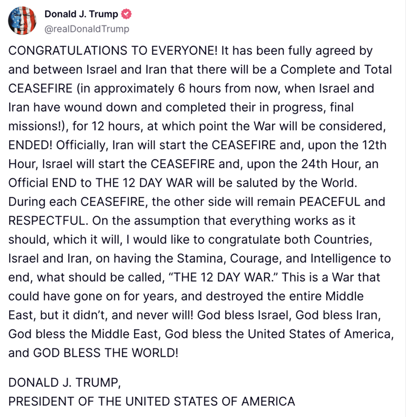 | 戰場形勢瞬息萬變!伊朗向卡塔爾美軍基地發射了7枚導彈後,美國總統特朗普宣布,以色列與伊朗已達成停火協議,為期十二日的戰事將會結束。 特朗普在社交平台Truth Social說,「以色列和伊朗已經完全同意,將全面停火(從現在起大約6小時後,當以色列和伊朗完成他們正在進行的最後任務時!),持續12小時,屆時戰爭將被視為結束!」 特朗普表示,我謹祝賀以色列和伊朗兩國,他們擁有足夠的毅力、勇氣和智慧,結束了這場應該被稱為『十二日戰爭』的戰爭。」停火對世界來說是美好的一天。當被問及停火將持續多久時,特朗普認為停火無限期,將永遠持續下去。 此次停火由特朗普本人、副總統萬斯及卡塔爾居中斡旋達成。特朗普23日和卡塔爾國王通話,告知對方美方能讓以色列同意與伊朗停火,要求卡塔爾說服伊朗同意停火,萬斯則與卡達首相辦公室協調停火細節。 卡塔爾首相與伊朗官員通話後,伊朗同意了美國提出的停火提議。 特朗普當天也與以色列總理通話,斡旋以方的停火協議。以色列提出的條件是,只要伊朗不再發動新一波攻勢,以色列就會同意停火,伊朗也表示將遵守協議。 |